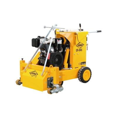 La fraise de surface CF-245 est une machine conçue pour rainurer les sols, donc pour tracer des rainures dont la largeur et l'écartement sont paramétrables (grooving). 2 blocs de roues réglables en hauteur permettent de paramétrer la profondeur des rainures, qui reste constante même si le sol n'est pas parfaitement droit. La largeur de coupe de 400 mm est considérable pour une machine de cette taille, et permet de travailler de façon productive avec des coûts réduits.